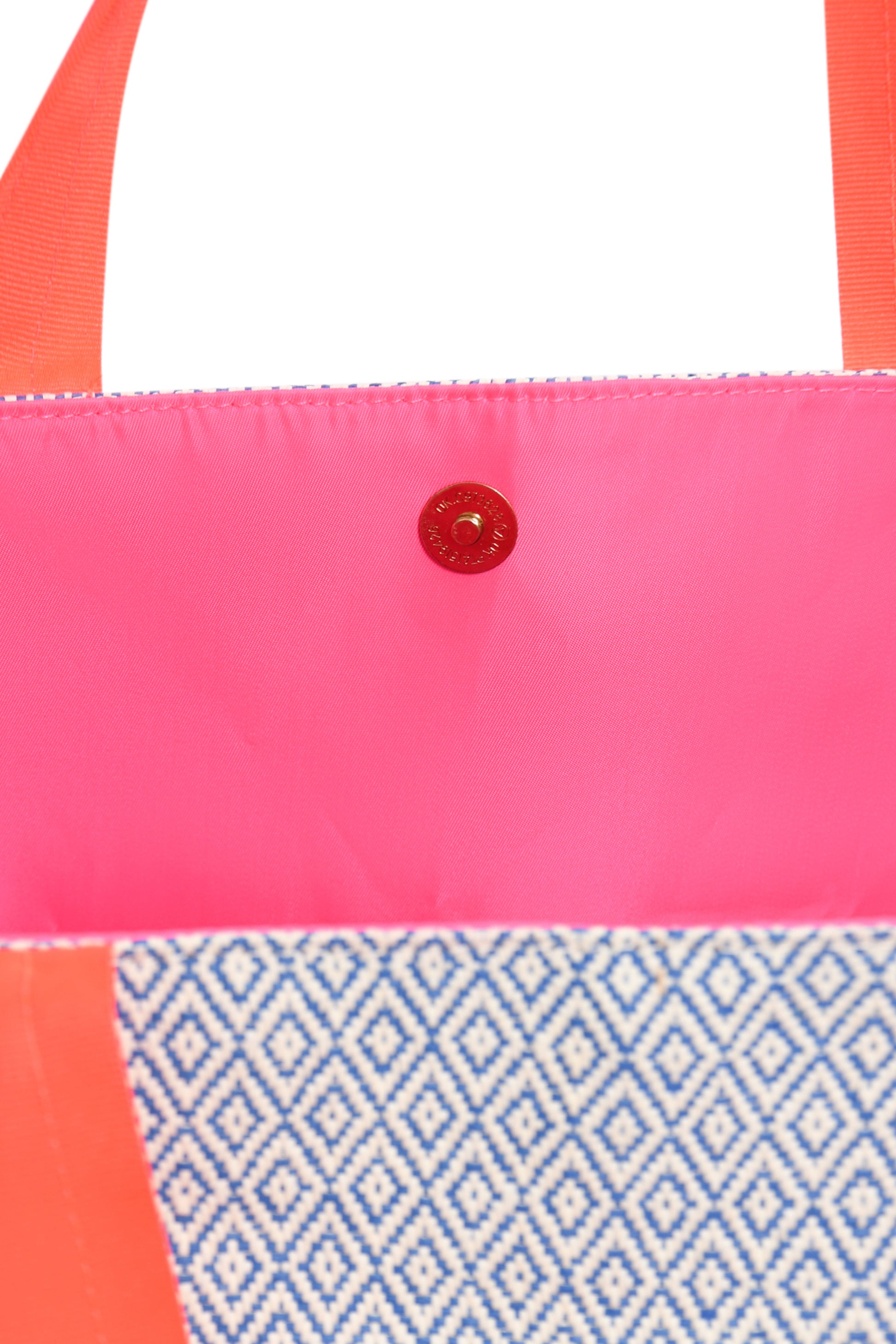 Where elegance meets energy. This stunning Diamond Weave Beach Bag features an woven blue and white geometric pattern brought to life with bold coral-pink straps that create an unexpectedly chic combination.