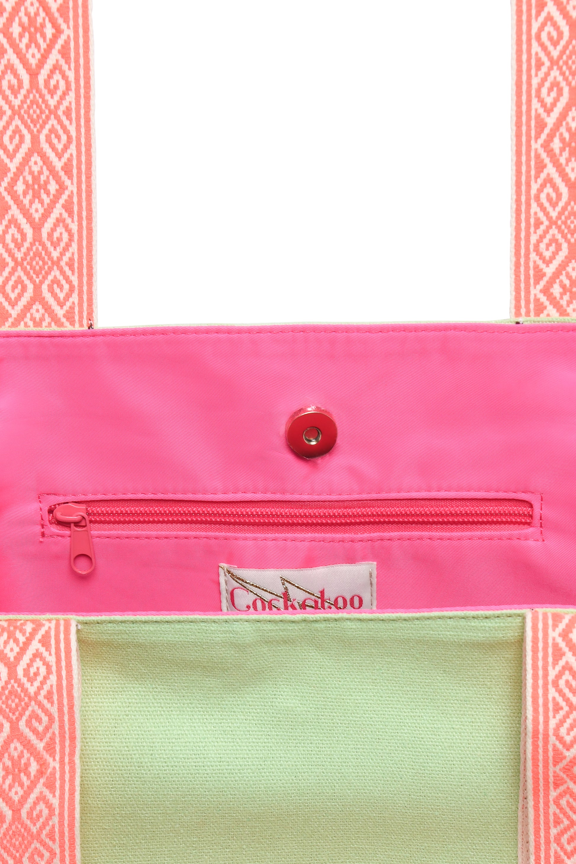 All Cockatoo beach bags are fully lined in hot pink water resistant fabric, they also have an internal zipped up pocket and a gold magnetic popper, and on one side of the bag the straps aren't sewn down all the way so you can slip your wet towel or sarong through so everything else inside the bag doesn't get soggy!