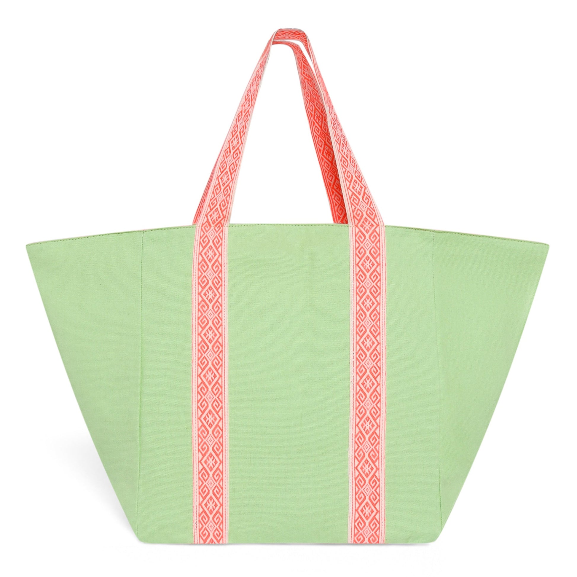This big light apple green canvas beach bag is one of our favourites. Its a large roomy square shape and can be used as a handbag or shopping bag but we love it most for a beach bag. The straps are made from a neon orange and cream woven strapping which is soft and flexible but strong enough to carry all your beachy bits and bobs.