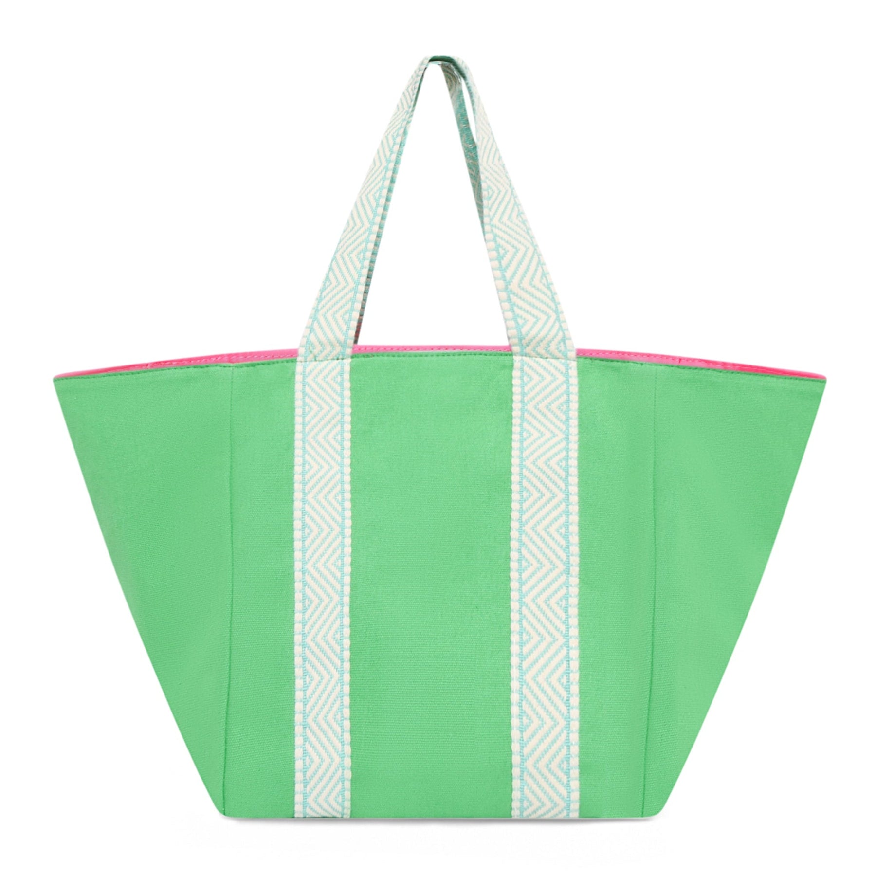 This smaller bright green cotton canvas beach bag is beach ready! Its a roomy square shape and can be used as a handbag, bookbag, gym bag or shopping bag but we love it most for a beach bag. The straps are made from a beautiful cream and turquoise woven strapping which are soft and flexible but strong enough to carry all your beachy bits.