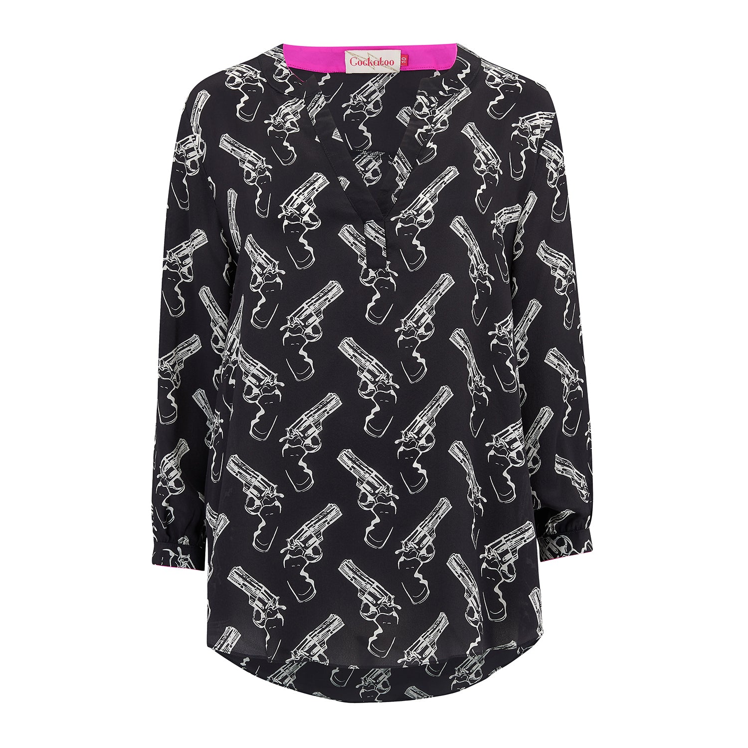 Stand out from the crowd in this bold statement silk print with pistols in a gorgeously flattering simple shape with an open v-neck. The hot pink flash inside collar adds a wonderful accent, together with a curved hem front and back.
